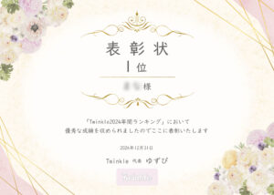 Twinkle様には、上期・下期の節目や年間ランキングの表彰など、所属ライバーさんへ贈る表彰状を度々ご依頼いただいています。先日発表された「2024年間ランキング」でも、たたえーるの表彰状をご活用いただきました。